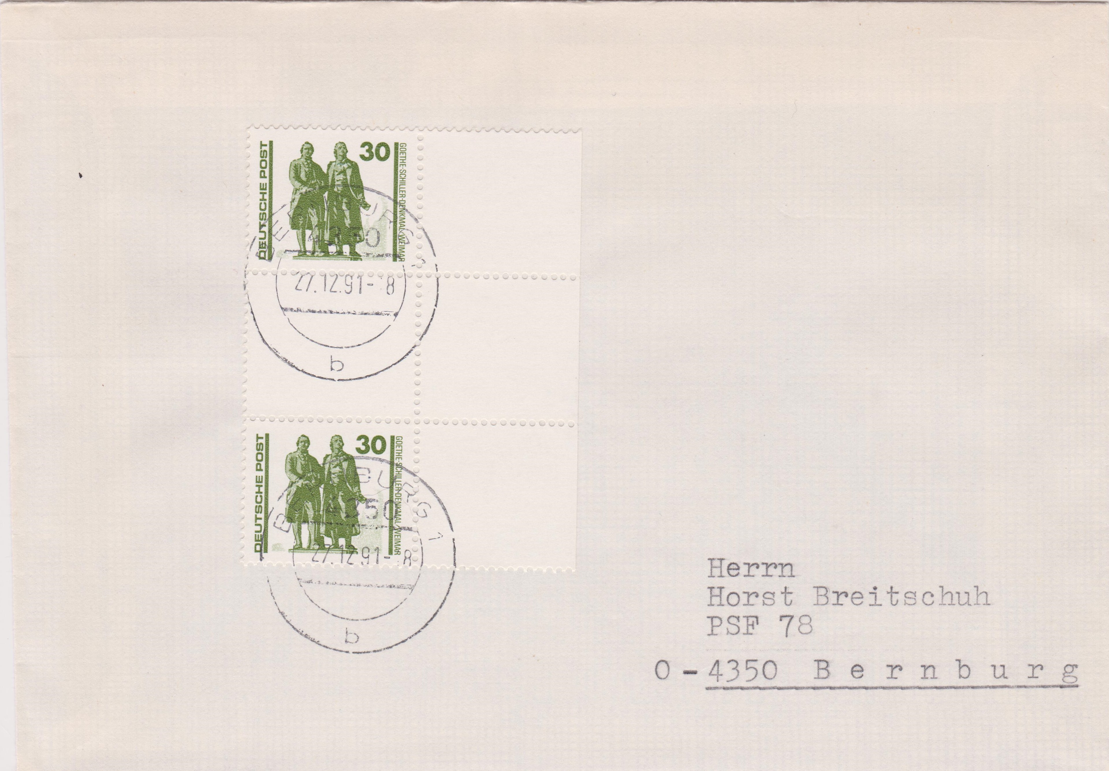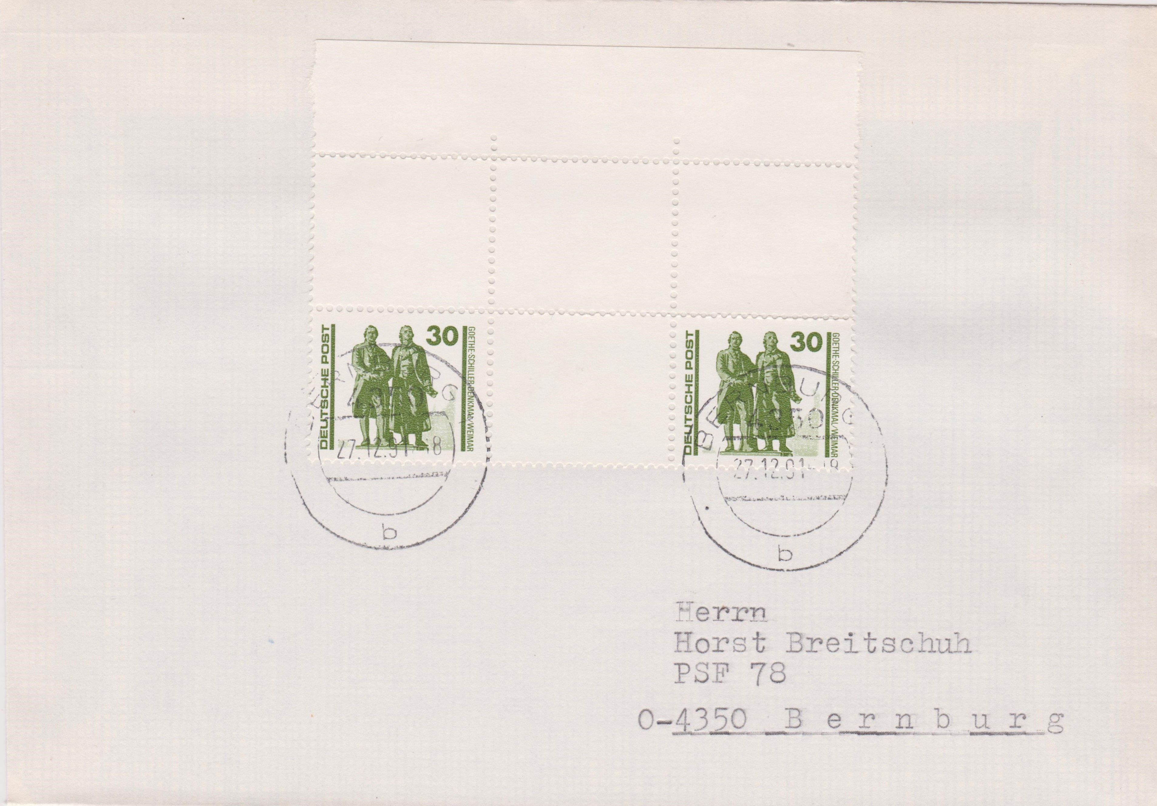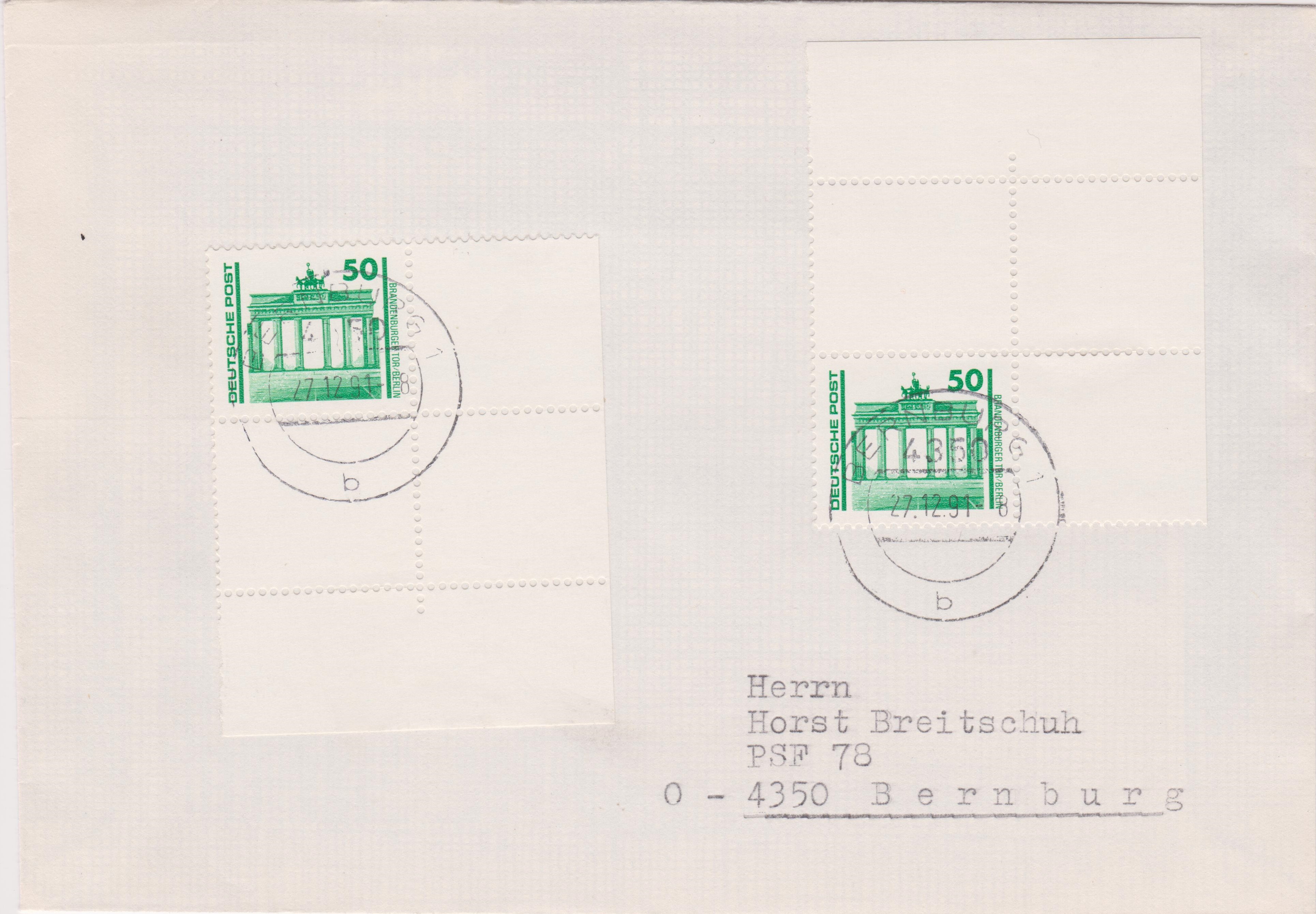 Bogenecken rechts oben sowie rechts unten der DDR MiNr. 3346 aus dem Markenheftchenbogen, am 27.12.1991 auf Beleg von Berlin nach O-4350 Bernburg: