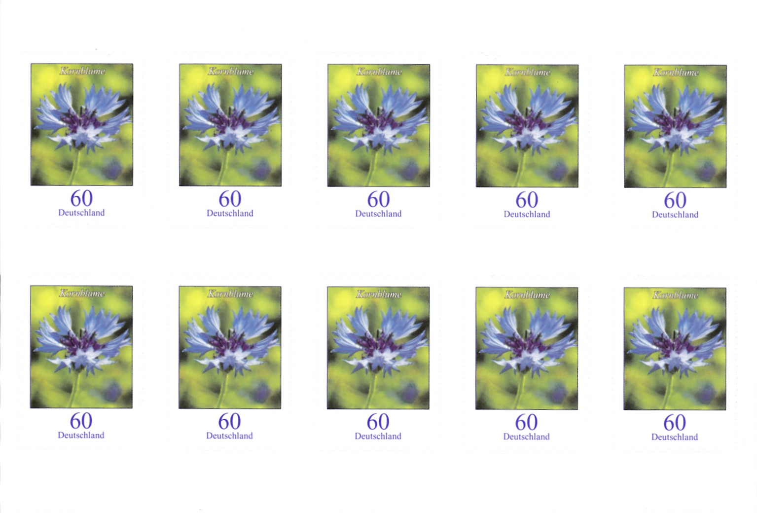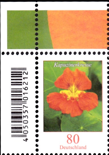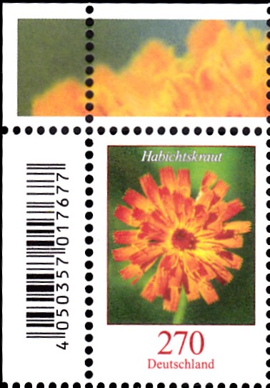 Am 1.6.2019 sind, wie bereits hier von Jens angekündigt, neue Wertstufen bzw schon vorhandene Wertstufen mit neuen Motoven. Es gibt eine Marke zu 60 Cent (MiNr 3468) mit dem neuen Motiv "Kornblume". Hier eine Bogenmarke vom Eckrand mit EAN-Codierung.