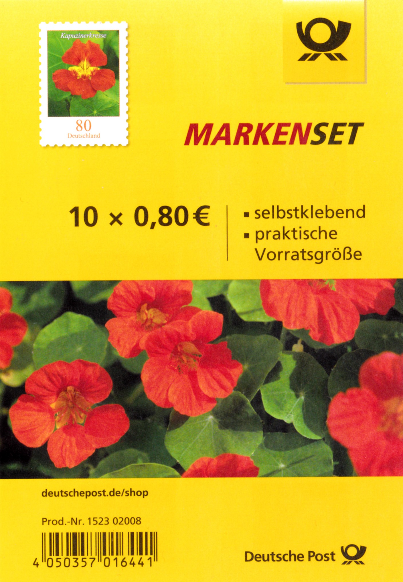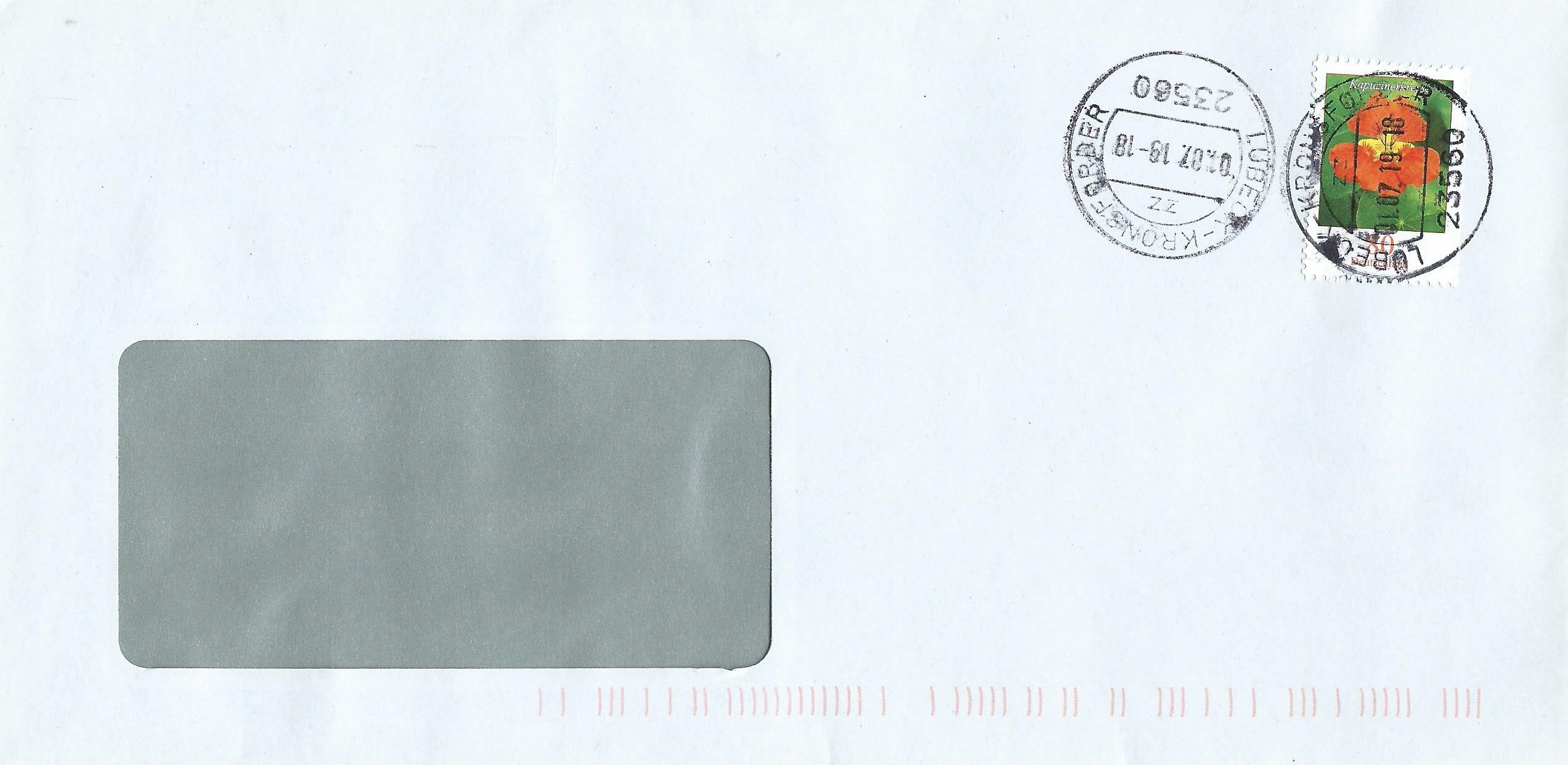 Einmal der Wert zu 80 Cent Kapuzinerkresse nassklebend mit Ortsstempel Lübeck Kronsforder. Der Ortskundige weiss natürlich, dass damit die Kronsforder Landstraße gemeint ist, für Ortsfremde hört sich der Stempeltext etwas merkwürdig an.