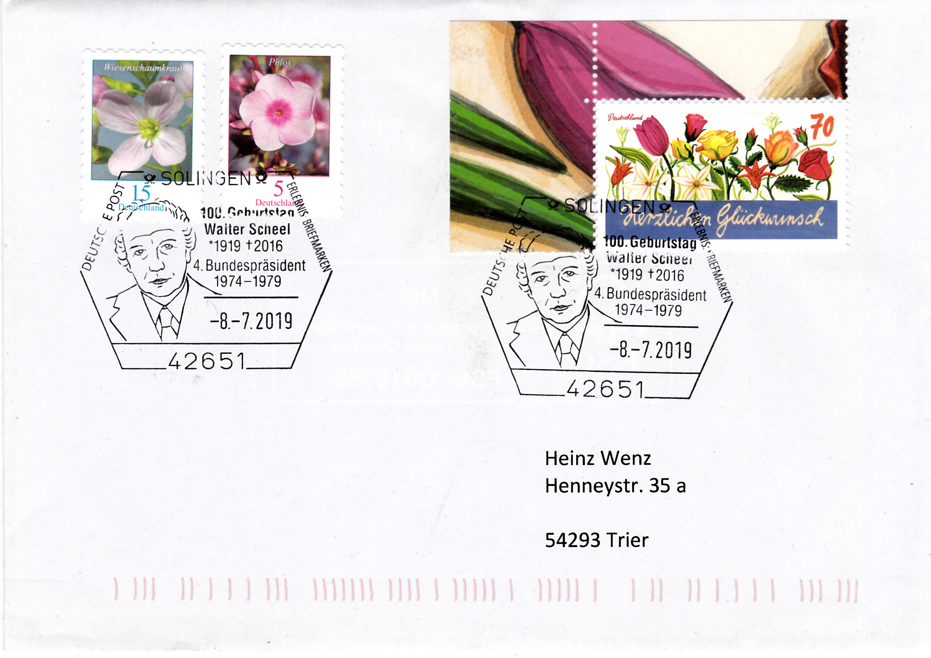 Zum 100. Geburtstag von Walter Scheel wurde in seinem Geburtsort Solingen ein Sonderstempel mit seinem Porträt eingesetzt.