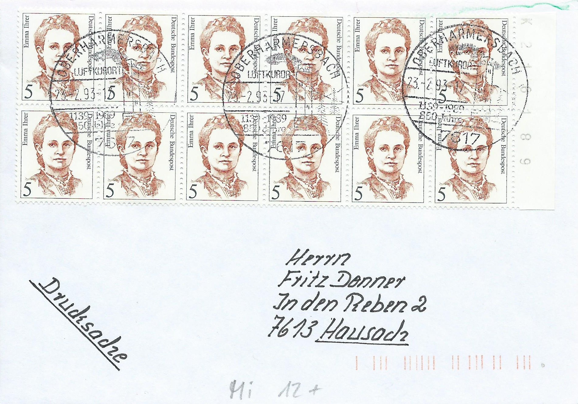 Den Anfang macht der Wert zu 5 Pf als waagerechter 12-er-Block vom rechten Bogenrand auf einer Drucksache. Auf dem Bogenrand ist auch noch die Bogenzählnummer vorhanden. Gestempelt wurde am 23.2.93 in Oberharmersbach mit einem Ortswerbestempel.
