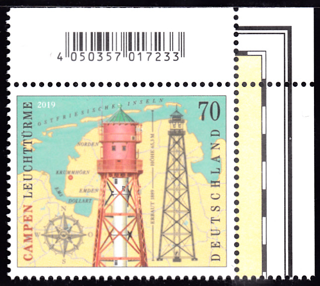 Auf einer Marke der Deutschen Post (MiNr 3465) ist der Leuchtturm abgebildet. Hier ein Eckrandstück mit EAN-Codierung: