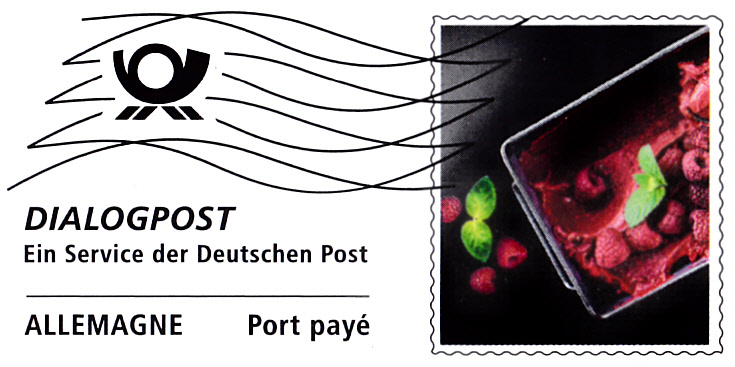 Diese Dialogpost des Edeka-Center Trier mit einem Wertstempelähnlichen Zudruck mit dem Motiv "Himbeersorbet" passt in eine Motivsammlung unter dem Gliederungspunkt "Nachspeisen".