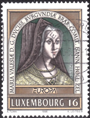 In Luxemburg erschienen die Europamarken 1996 am 20. Mai 1996 zum Gemeinschaftsthema "Berühmte Frauen". Hier eine Marke zu 16 Franc mit einem Porträt von Maria von Burgund (1457-1482), Herzogin von Luxemburg. Die Auflage der Marke betrug 600 000 Stück