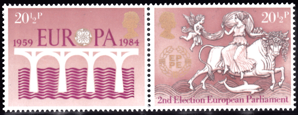 Zur zweiten Direktwahl zum Europäischen Parlament sind in den Großbritannien zwei Marken bildgleiche mit der Darstellung der " Entführung der Europa durch Zeus" erschienen.