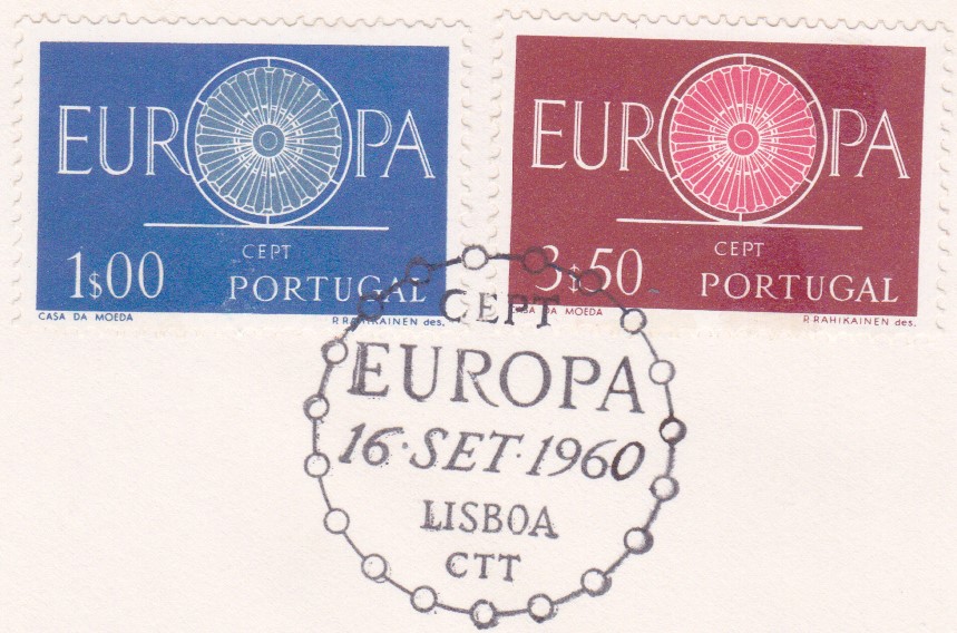 In Portugal sind die Europamarken 1960 am 16. September 1960 mit dem Gemeinschaftsmotiv "„O“ in „EUROPA“ als Wagenrad mit 19 Speichen" erschienen. Hier der Wert zu 3,50 Escudo braunkarmin/karmin, der in einer Auflage von 1 000 000 Stück erschien.