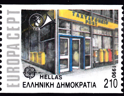 Die Europamarken 1990 sind in Griechenland zum Gemeinschaftsthema "Postalische Einrichtungen" am 11. Mai 1990 erschienen. Die Marke gibt es in zwei Zähnungen: A = vierseitig gez. K 13 3/4:12 1/4 und C = senkrecht gez. 12 1/4. Hier eine Marke zu 210 Drachmen aus dem Heftchen (MiNr 1743 C) mit der Abbildung eines Modernen Postamtes in Athen. Die Auflage dieser Marke betrug 200 000 Stück.