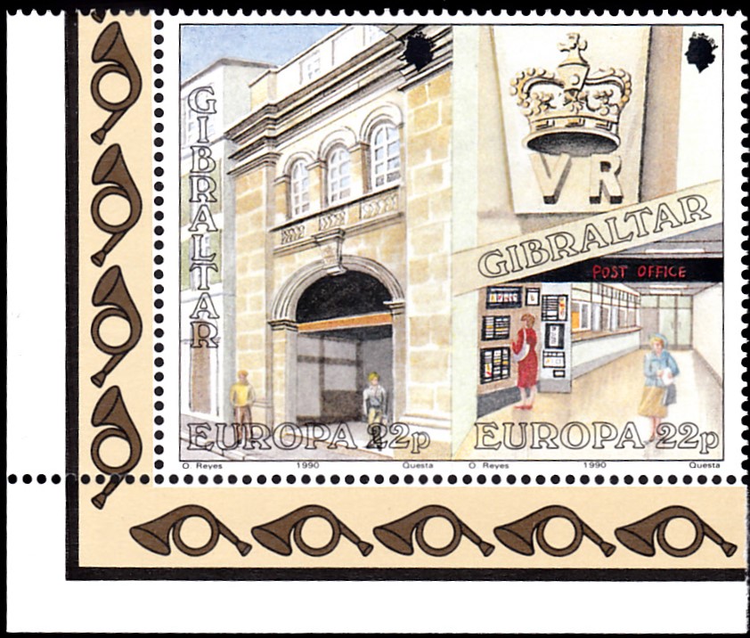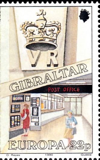 Die Europamarken 1990 sind in Gibraltar zum Gemeinschaftsthema "Postalische Einrichtungen" am 6. März 1990 erschienen. Hier eine Marke zu 22 Pence mit einer Schalterhalle.