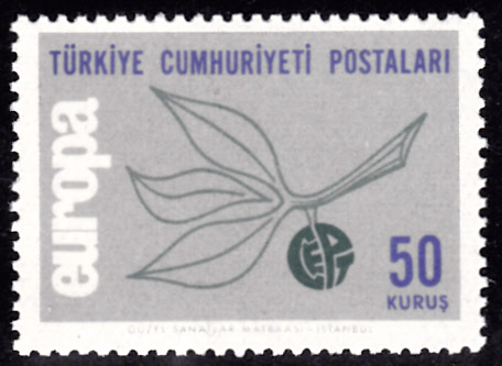 In der Türkei erschienen die Europamarken 1965 am 27. September 1965. Hier die Marke zu 50 Kurus mit dem Gemeinschaftsmotiv "Zweig mit aus den Buchstaben „CEPT“ gebildeter Frucht ", die in einer Auflage von 600 000 Stück erschien.