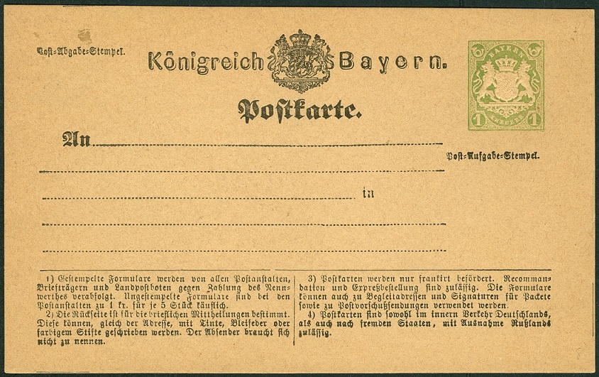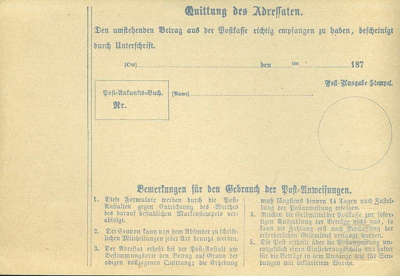 Im Jahre 1874 gab die bayerische Post weitere Postanweisungen heraus. Jedoch in verändertem Format: 160x106mm. Eine der Postanweisungen ist die