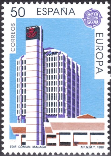 Die Europamarken 1990 sind in Spanien zum Gemeinschaftsthema "Postalische Einrichtungen" am 4. Mai 1990 erschienen. Hier die Marke zu 50 Pesetas mit der Abbildung des Modernen Postgebäude in Málaga. Die Auflage der Marke betrug 3 000 000 Stück.