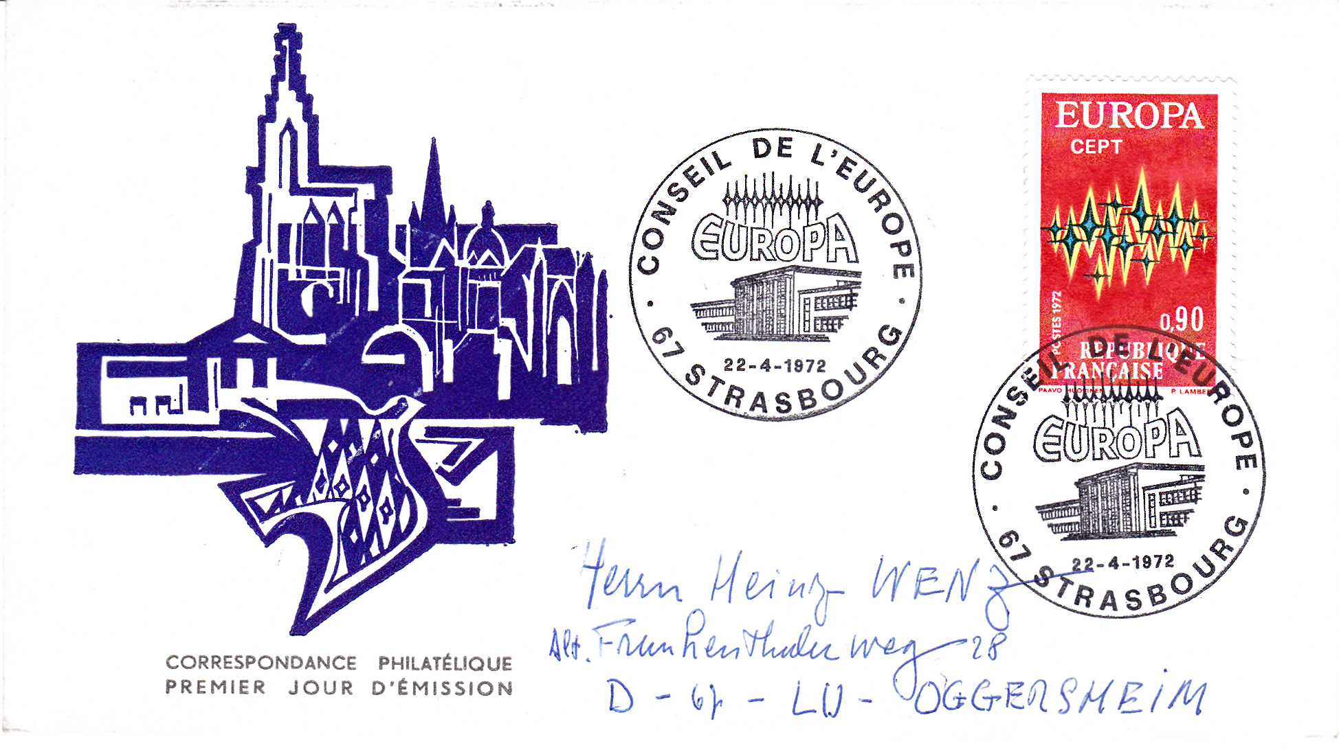In Frankreich erschienen die Europamarken 1972 am 22. April 1972. Hier die Marke zu 0,90 Fr mit dem mit dem Gemeinschaftsmotiv "Sterne" als Einzelfrankatur auf einem Brief von Straßburg nach Ludwigshafen. Die Abstempelung erfolgte mit einem Sonderstempel beim Postamt des Europarates vom 22.4.1972 am Ersttag der Marke. Die Auflage der Marke betrug 10 500 000 Stück.