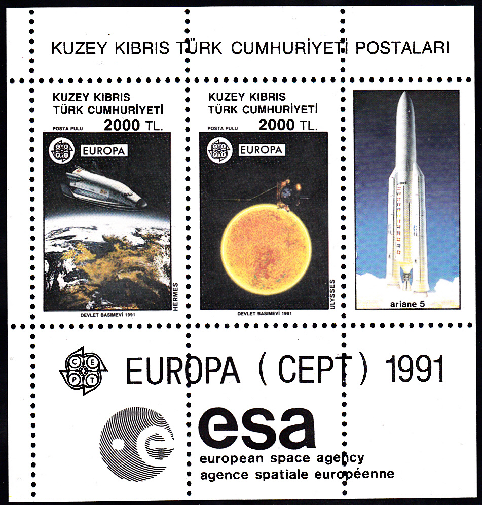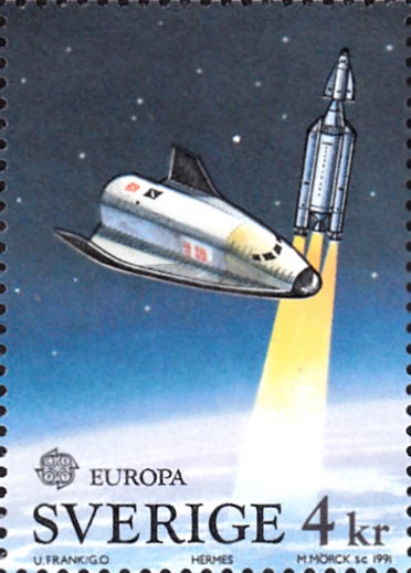 Auf einer Europamarke aus Türkisch-Zypern (MiNr 303) wird ein Modell der Raumfähre "Hermes" gezeigt.
