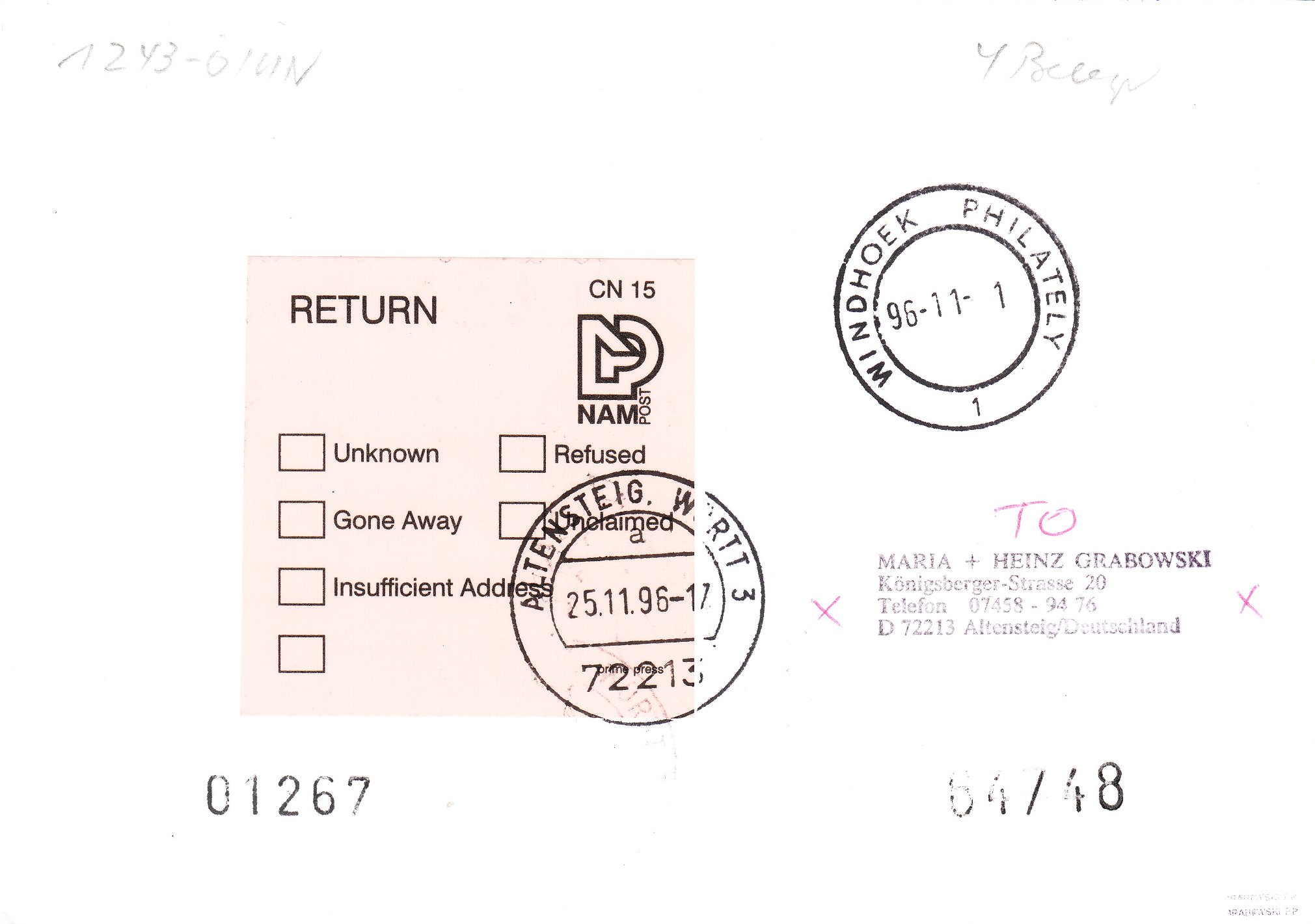 Auch auch dieser an dieselbe Postlageradresse "poste Restante" adressierte Beleg wurde innerhalb der Lagerfrist nicht abgeholt. Daher wurde rückseitig von der Post von Namibia der knallrote Aufkleber "Unclaimed" angebracht und der Beleg wurde an den Absender nach 72213 ALTENSTEIG in Deutschland zurückgeleitet, was ein am 25.11.1996 abgeschlagener Tagesstempel dokumentiert.