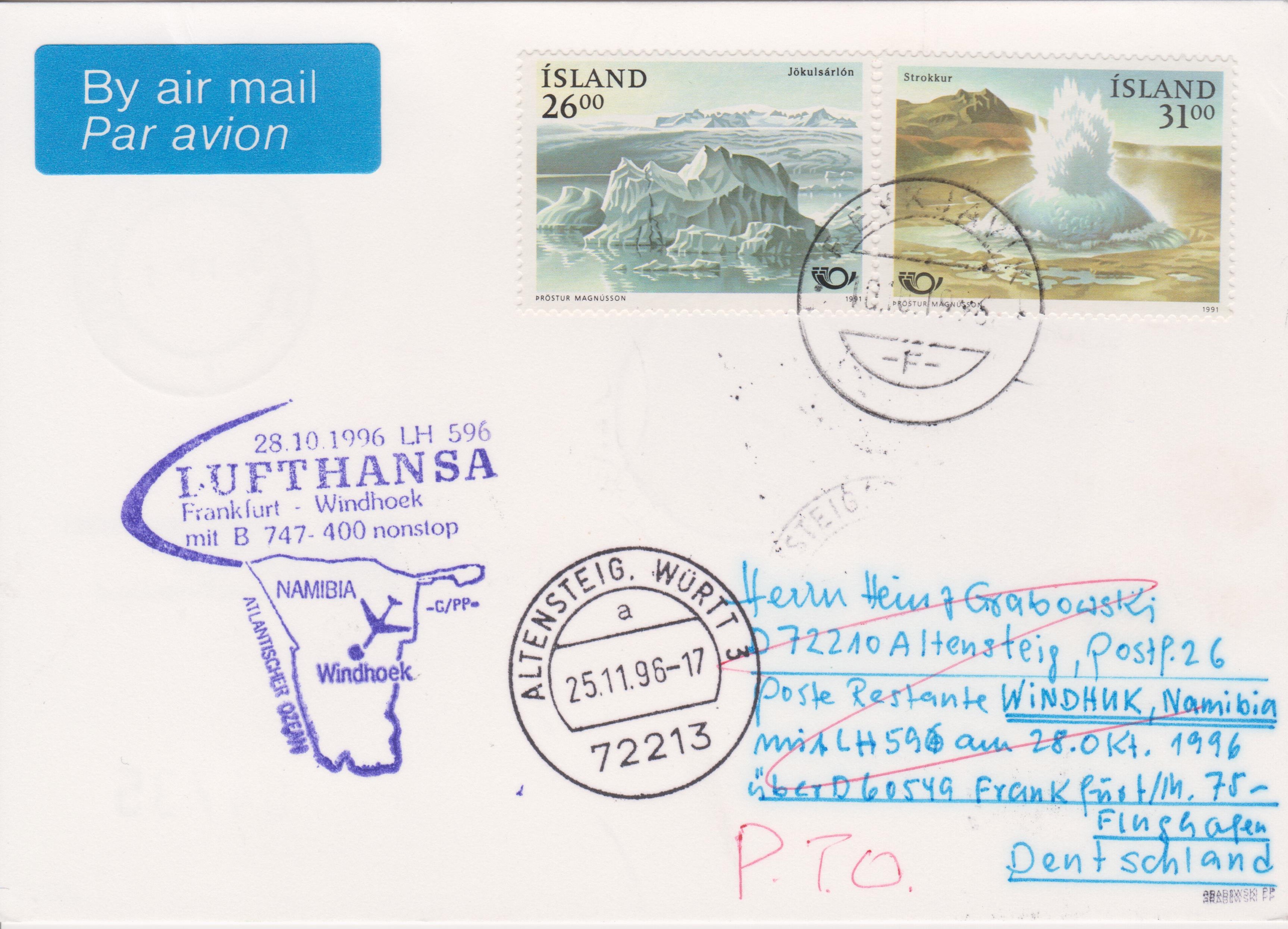Der Beleg wurde auf dem Erstflug LH 596 befördert, worauf ein Cachetstempel in violett hinweist, und die Frankatur wurde am Erstflugtag 28.10.1996 mit dem entsprechenden Sonderstempel entwertet. Rückseitig Tagesstempel WINDHOEK vom 01.11.1996 als Ankunftsstempel: