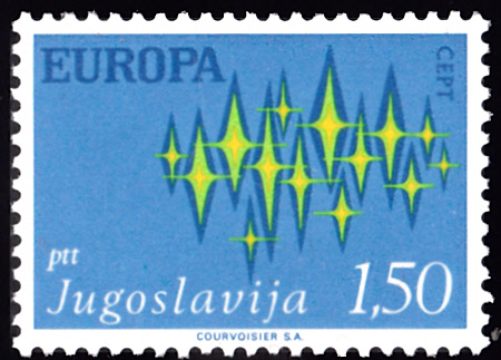 In Jugoslawien erschienen die Europamarken 1972 am 3. Mai 1972. Hier die Marke zu 1,50 Dinar mit dem Gemeinschaftsmotiv "Sterne", die in einer Auflage von 985 869 Stück erschien.