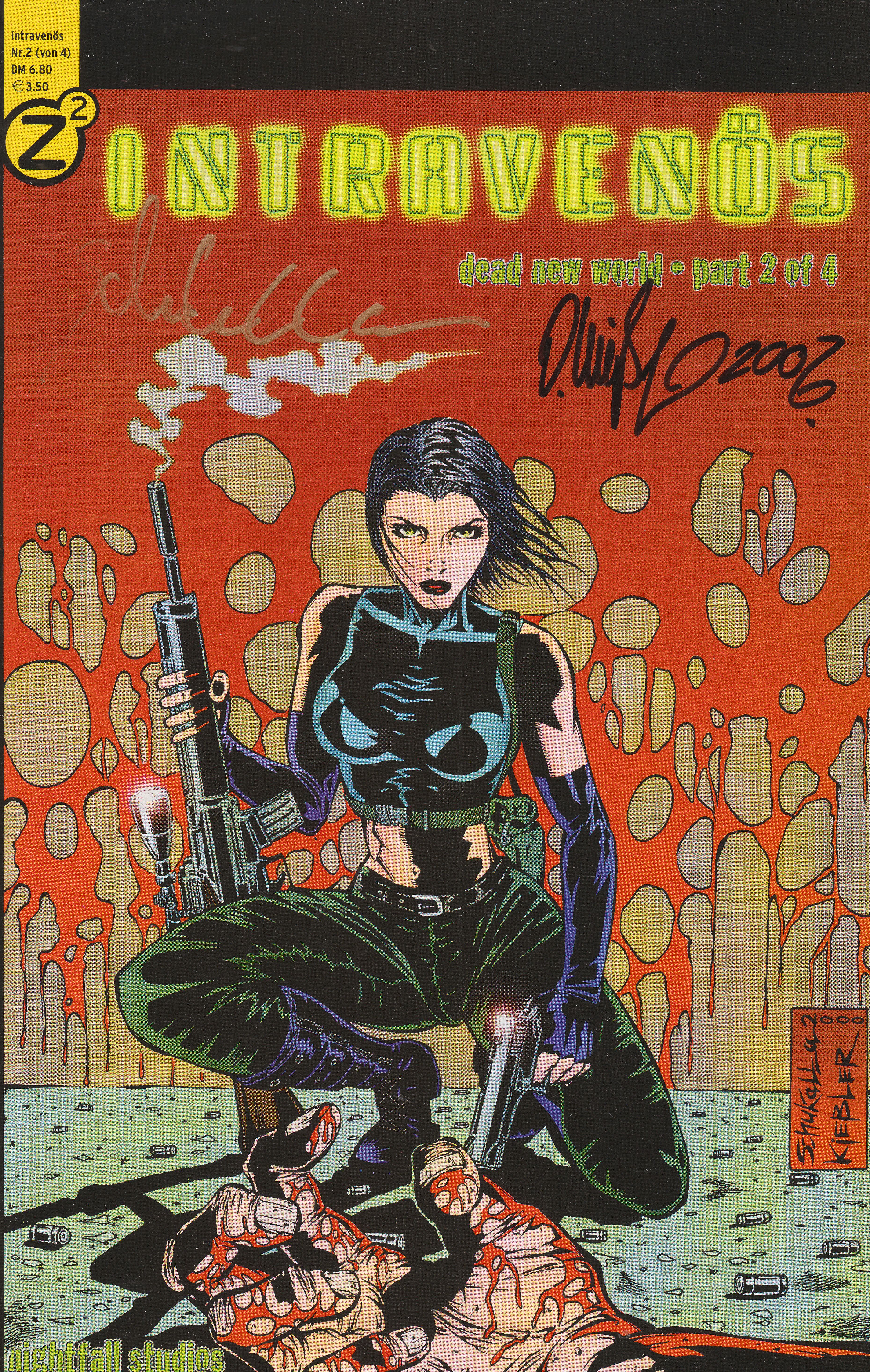 Dieses Comicheft "INTRAVENÖS: dead new world - part 2 of 4" wurde signiert von Daniel Kießler (words & inks) sowie Thomas Schukalla (pencils):