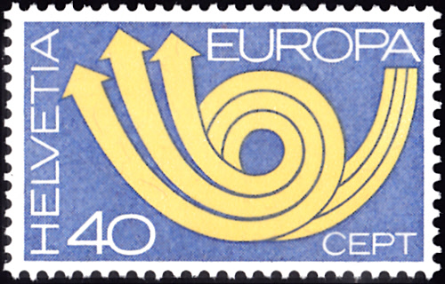 In der Schweiz erschienen die Europamarken 1973 am 30. April 1973. Hier die Marke zu 40 Rappen mit dem Gemeinschaftsmotiv "Stilisiertes Posthorn ", die in einer Auflage von 14 932 000 Stück erschien.