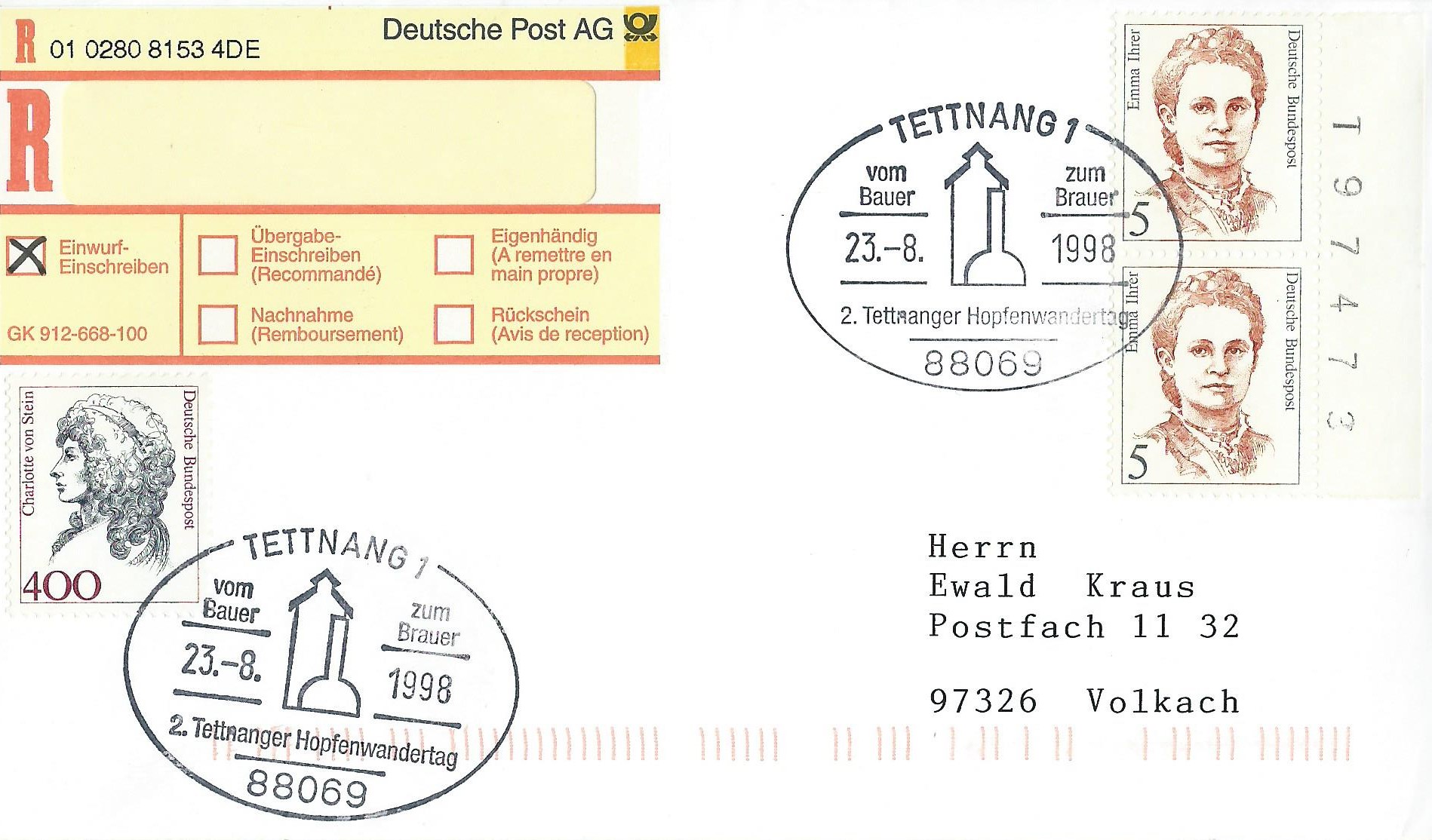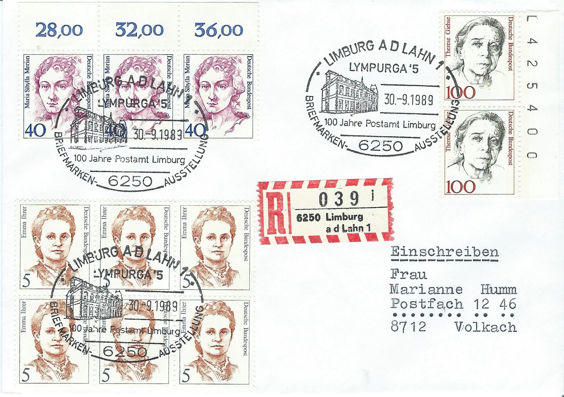 Und als Abschluss für heute eine „wilde“ Buntfrankatur als Einschreiben: Je ein Wert zu 180, 120, 20 und 10 Pf, dazu ein waagerechtes Paar zu 5 Pf (das alles ohne Rand) und ein waagerechtes Paar zu 5 Pf aus der rechten unteren Bogenecke mit Formnummer 3. Gestempelt wurde mit einem Sonderstempel aus Leverkusen am 19.8.89: