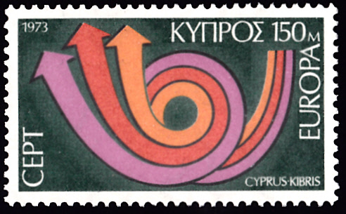 In Zypern erschienen die Europamarken 1973 am 7. Mai 1973. Hier die Marke zu 150 Mills mit dem Gemeinschaftsmotiv "Stilisiertes Posthorn ". Die Auflage der Marke betrug 369 436 Stück.