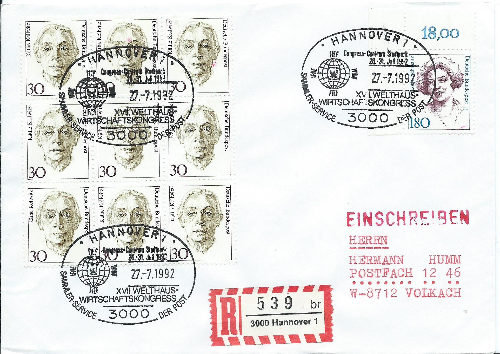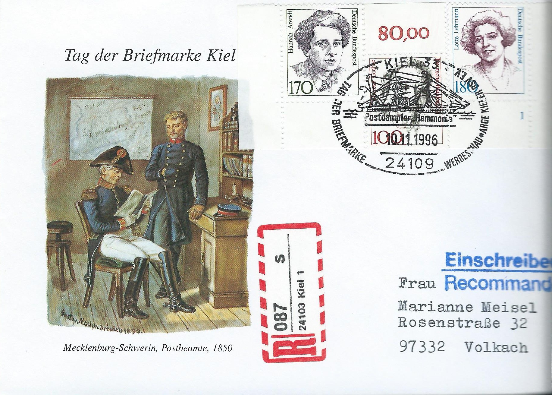 Dieser Beleg zeigt uns eine linke untere Bogenecke zu 170 Pf, ein Oberrandstück zu 100 Pf mit Reihenwertzähler 80,00 und eine rechte untere Bogenecke zu 180 Pf mit Formnummer 1 auf einem Einschreiben. Gestempelt wurde am 10.11.96 mit einem Sonderstempel aus Kiel.