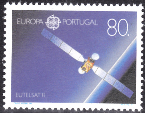 In Portugal erschienen die Europamarken 1991 zum Gemeinschaftsthema "Europäische Weltraumfahrt" am 11. April 1991. Hier die Marke zu 80 Escudo mit dem Fernmeldesatellit "EUTELSAT II".