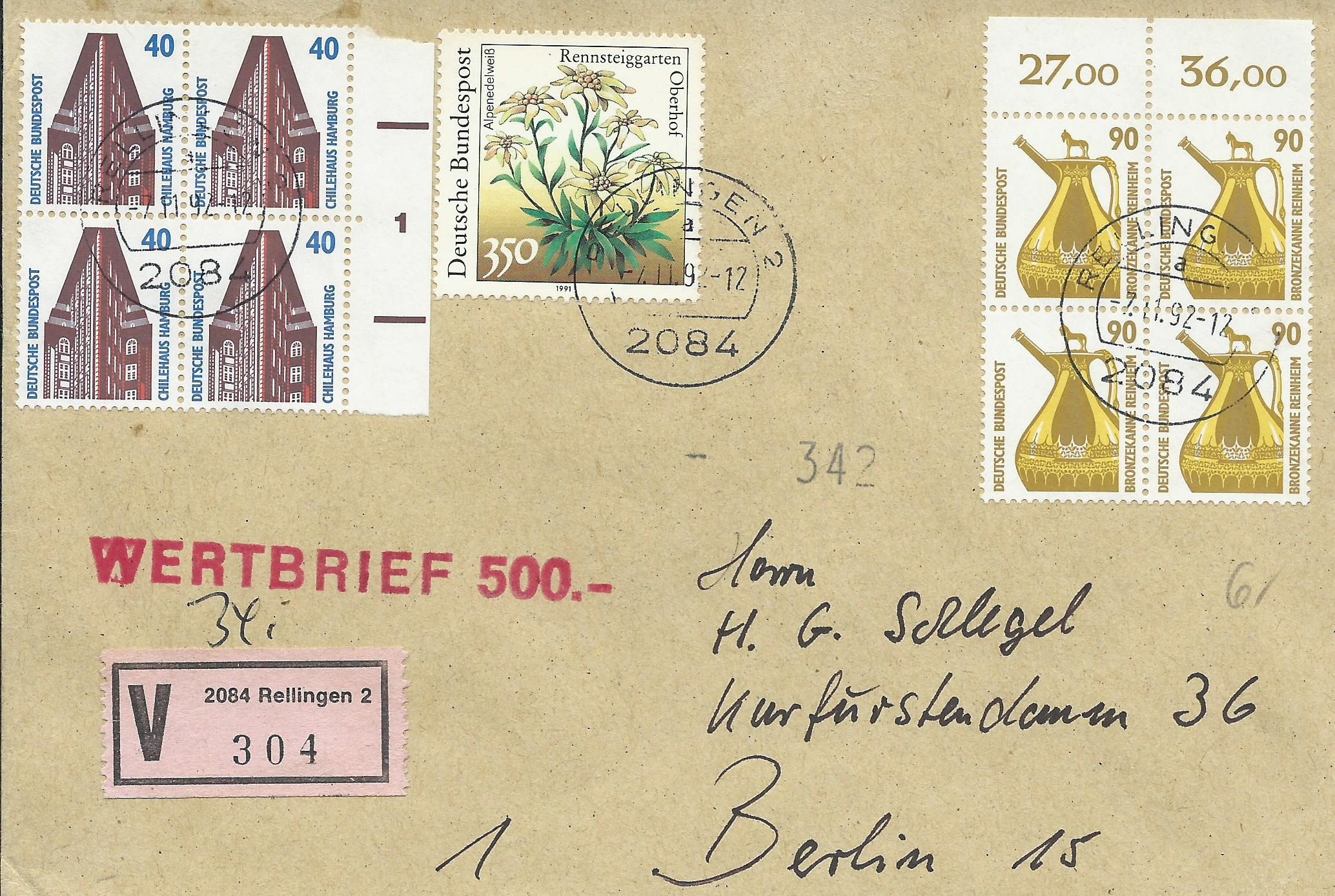 Dann habe ich noch einen Wertbrief: Als Frankatur dienen ein 4-er-Block zu 90 Pf vom Oberrand mit Reihenwertzähler 27,00 und 36,00, eine Sondermarke zu 350 Pf und ein 4-er-Block zu 40 Pf vom rechten Bogenrand mit Formnummer 1. Gestempelt wurde er in Rellingen am 7.11.92. Übrigens: Der Empfänger ist in der Philatelie kein Unbekannter. Es handelt sich um den Briefmarkenprüfer Schlegel!