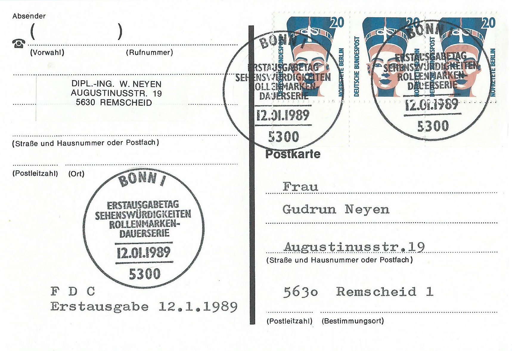 Als letzter Beleg für heute eine Postkarte mit einem waagerechten 3-er-Streifen zu 20 Pf. Gestempelt wurde mit dem Ersttagssonderstempel Bonn am 12.1.89.