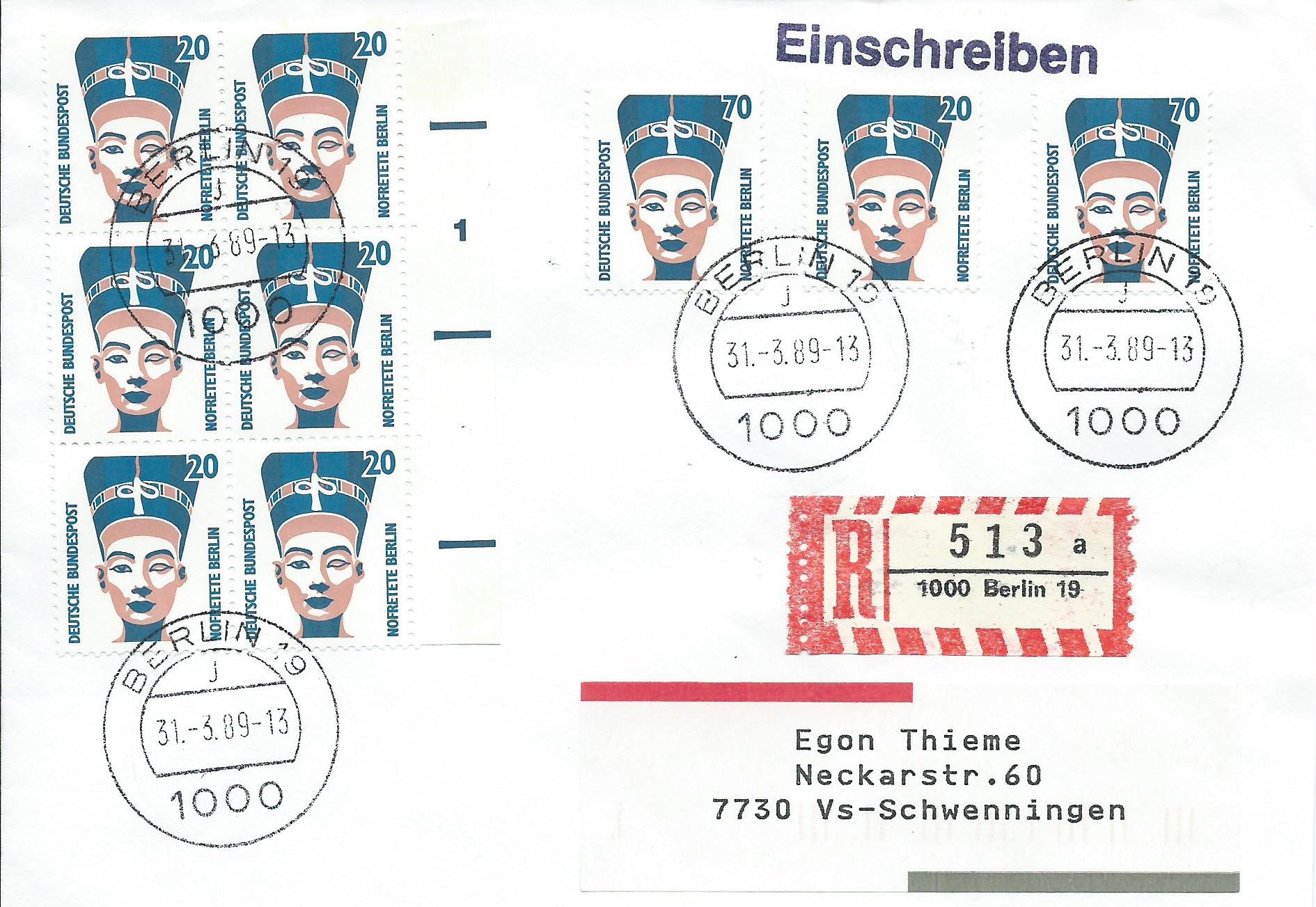 Den Anfang macht der Wert zu 20 Pf als senkrechter 6-er-Block nebst einer Einzelmarke und zwei motivgleichen Einzelmarken zu 70 Pf auf einem Einschreibbrief, also passende Portostufe 2,80 DM. Gestempelt wurde der Beleg am 31.3.89 in Berlin 19.