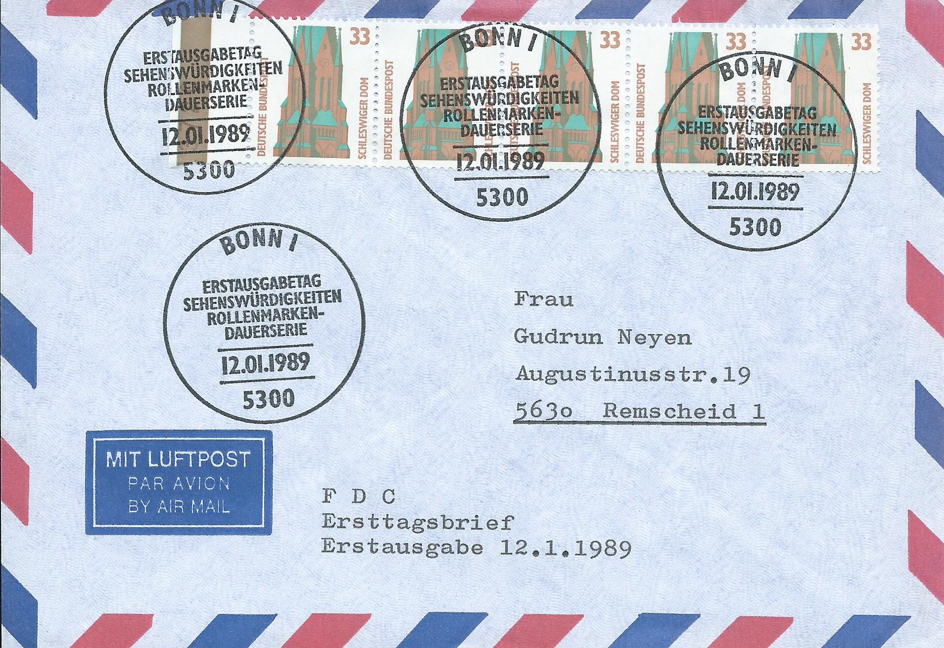 Zum einen kommt hier ein senkrechter 5-er-Streifen zu 33 Pf ohne Rand. Da war doch was? Richtig! Das ist ein Streifen von der Rolle, wobei wie immer eine Marke eine rückseitige Nummer aufweist. Gestempelt wurde hier mit dem Ersttagssonderstempel Bonn am 12.1.89.