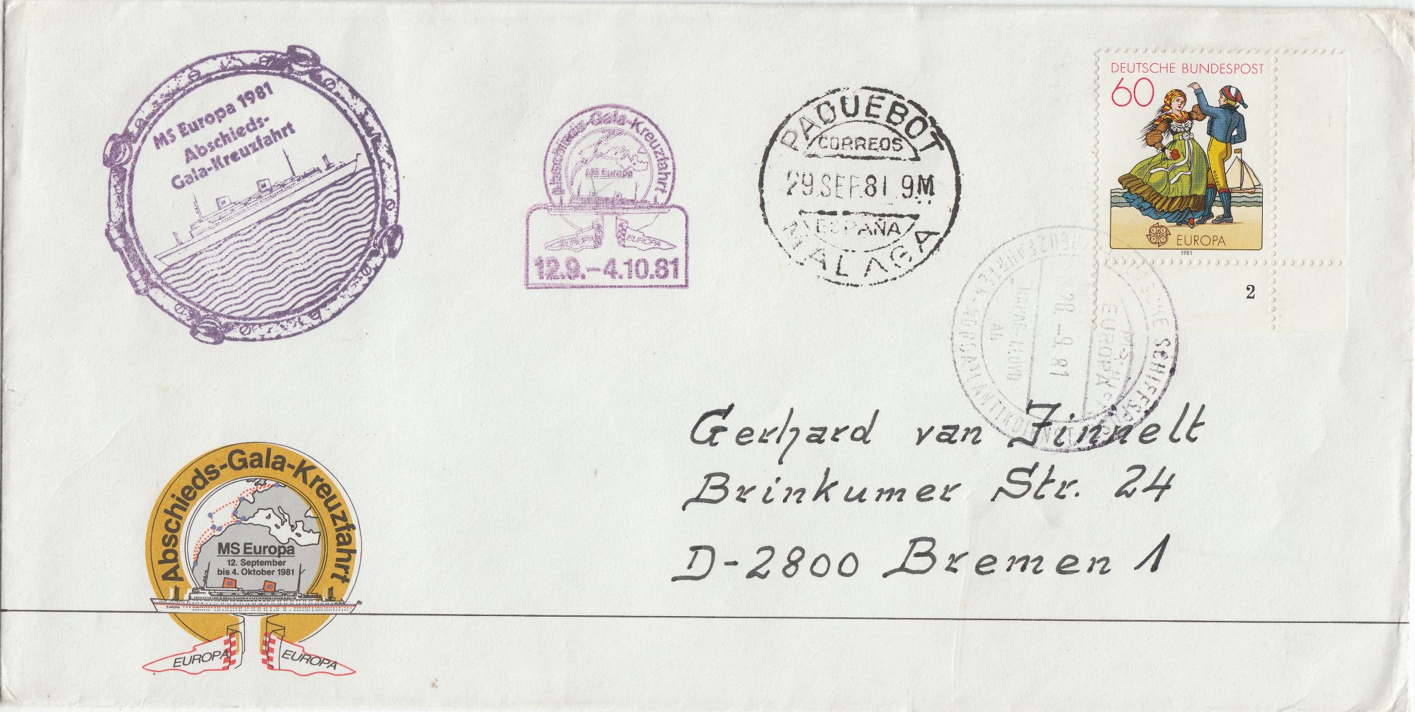 Das Eckrandstück mit Formnummer 2 der deutschen Ausgabe der Europamarke 1981 wurde am 28.09.1981 an Bord des Schiffes mit dem Schiffspoststempel der MS EUROPA entwertet. Am folgenden Tag, dem 29.09.1981, wurde der Beleg dann in Malaga der spanischen Post zur Weiterbeförderung übergeben, was ein Tagesstempel "PAQUEBOT" dokumentiert.