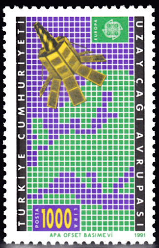In der Türkei erschienen die Europamarken 1991 zum Gemeinschaftsthema "Europäische Weltraumfahrt" am 6. Mai 1991. Hier die Marke zu 1000 Lira mit der Abbildung eines Fernmeldesatelliten vor einer Landkarte. Die Auflage dieser Marke betrug 600 000 Stück.
