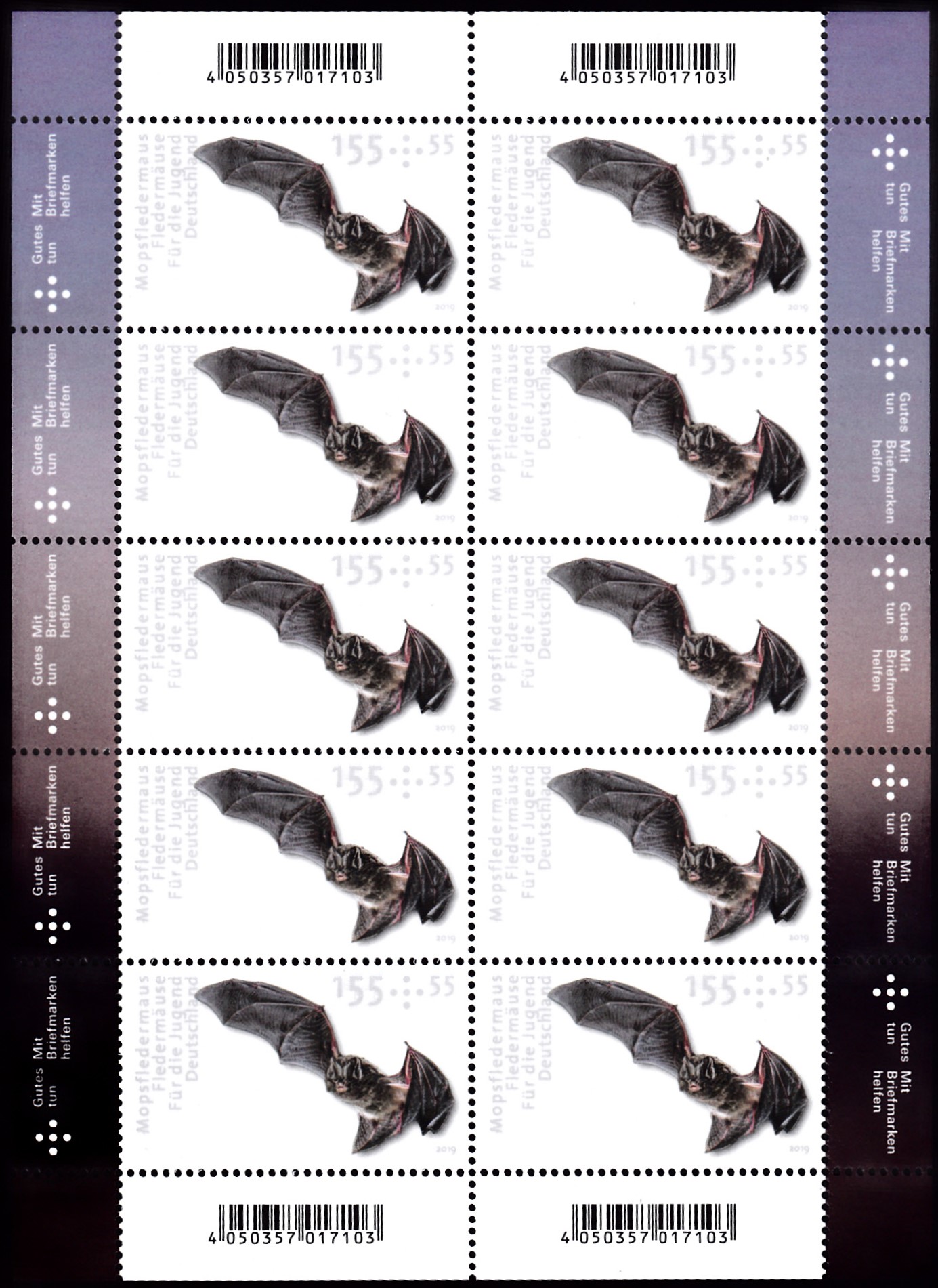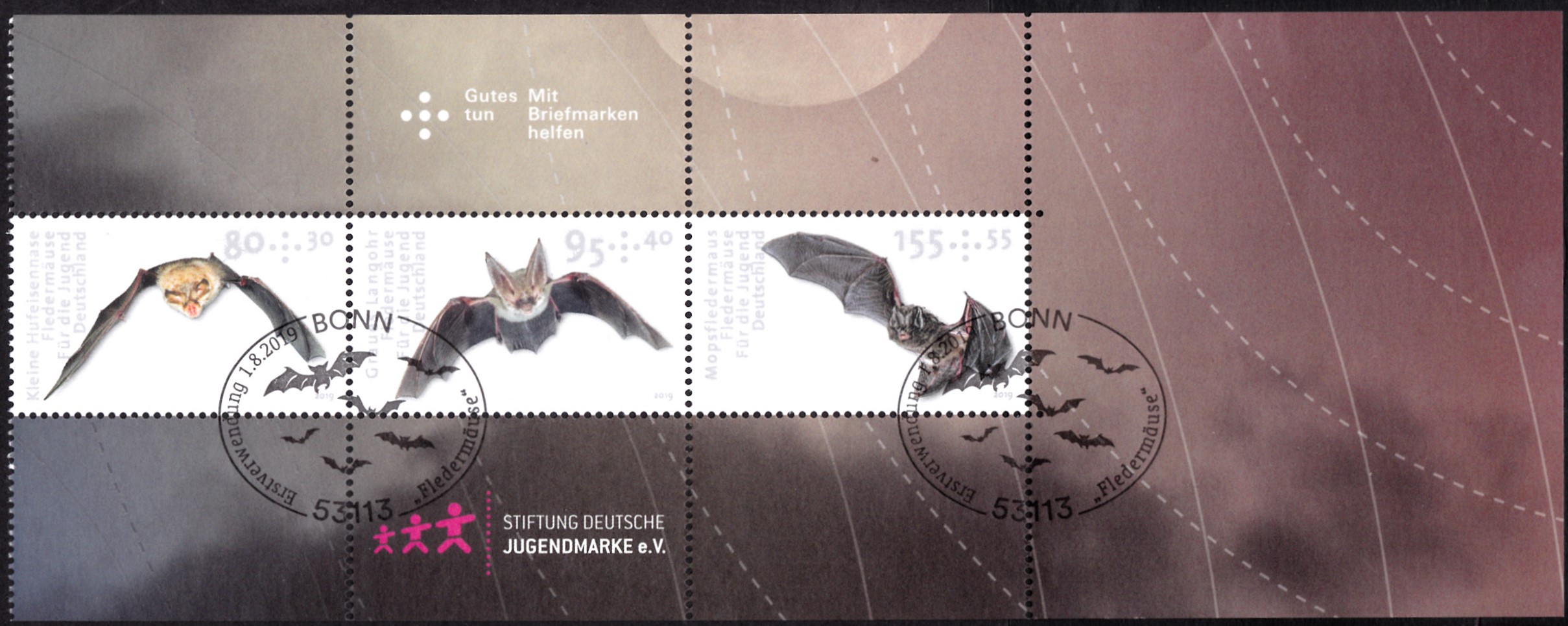 Die drei Jugendmarken 2019 mit Fledermausabbildungen wurden auch als Zusammendruck in einem Markenheftchen verkauft.
