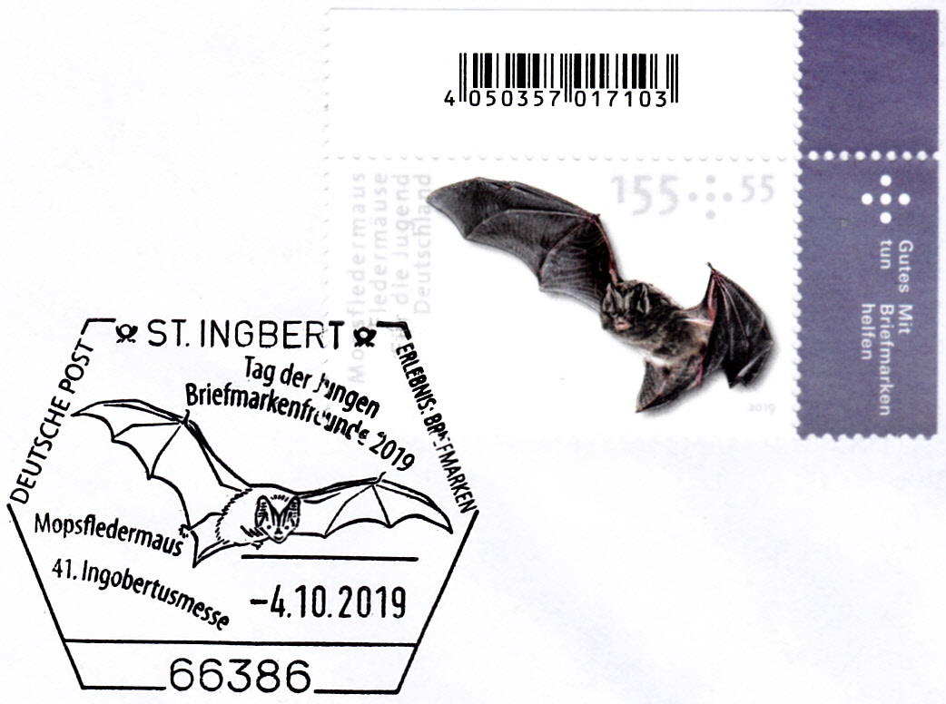 Sonderstempel aus St. Ingbert vom 4.10.2019 zum Tag der Jungen Briefmarkenfreunde mit einer Mopsfledermaus im Stempelbild.