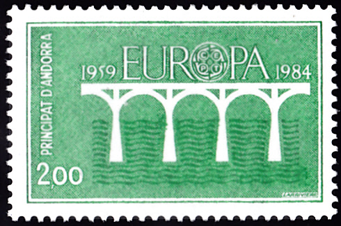 Bei der französischen Post in Andorra erschienen die Europamarken 1984 anlässlich dem Jubiläum "25 Jahre Europäische Konferenz der Verwaltungen für das Post- und Fernmeldewesen (CEPT)" im einheitlichen Motiv "Brücke" am 5. Mai 1984. Hier die Marke zu 2,00 Franc, die in einer Auflage von 800 000 Stück erschien.