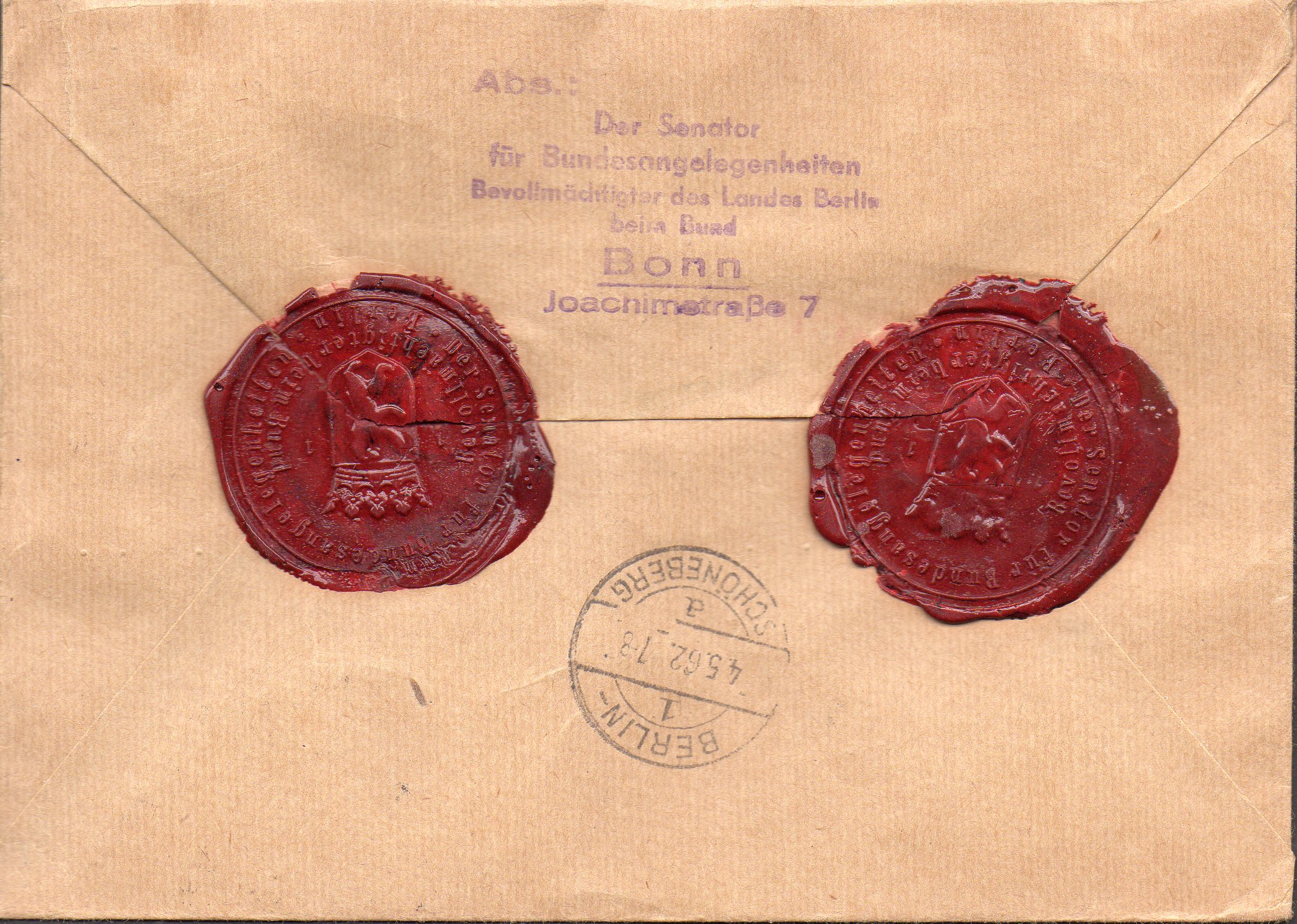 Einschreiben mit einem rechten Seitenrandstück der 90 Pf-Marke mit Ersttagssonderstempel Bonn vom 3.8.64. Da hat man für sein Geld noch etwas Leistung erhalten können, er wurde von der Postlagerung noch an eine neue Anschrift weitergeleitet.
