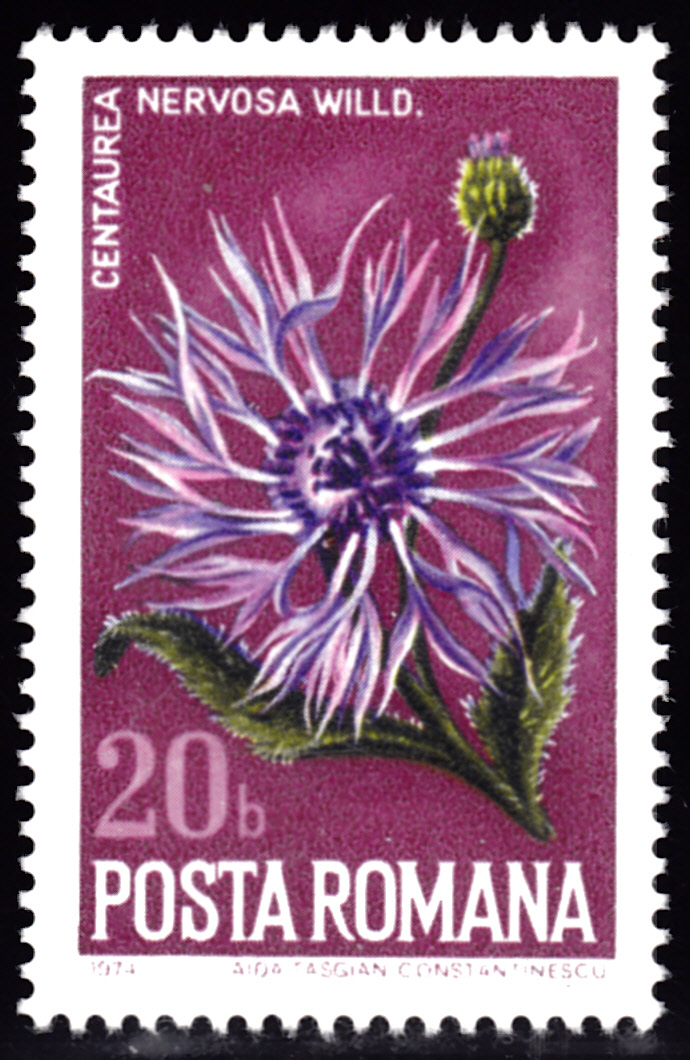 Aus Rumänien kommt diese Marke (MiNr 3224) mit einer Federigen Flockenblume (Centaurea nervosa).