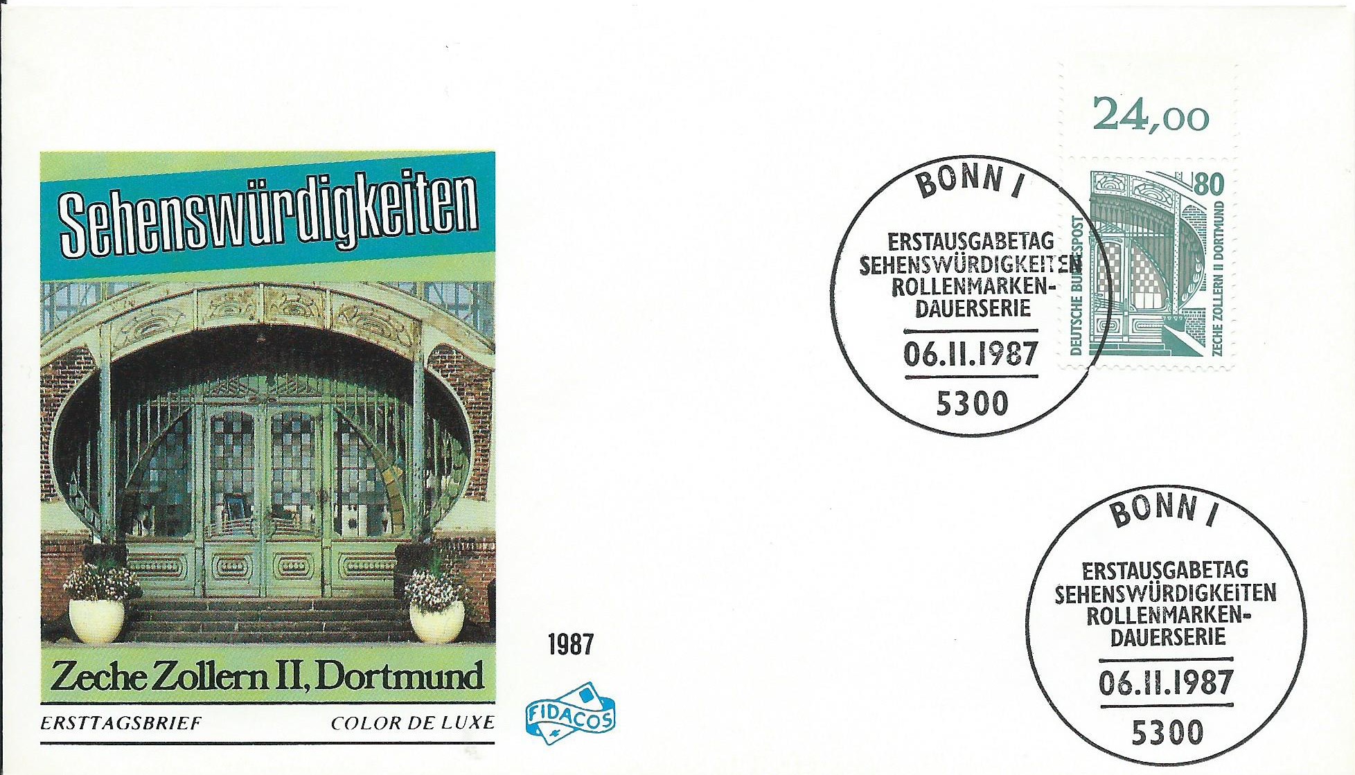 Der Wert zu 80 Pf vom Oberrand mit Reihenwertzähler 24,00 auf Ersttagsbrief mit Ersttagssonderstempel Bonn vom 6.11.87:
