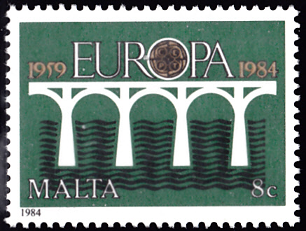 In Malta erschienen die Europamarken 1984 anlässlich dem Jubiläum "25 Jahre Europäische Konferenz der Verwaltungen für das Post- und Fernmeldewesen (CEPT)" im einheitlichen Motiv "Brücke" am 27. April 1984. Hier die Marke zu 8 Cent.