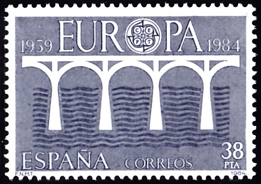 In Spanien erschienen die Europamarken 1984 anlässlich dem Jubiläum "25 Jahre Europäische Konferenz der Verwaltungen für das Post- und Fernmeldewesen (CEPT)" im einheitlichen Motiv "Brücke" am 5. Mai 1984. Hier die Marke zu 38 Pesetas, die in einer Auflage von 6 000 000 Stück erschien.
