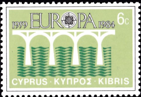 In Zypern erschienen die Europamarken 1984 anlässlich dem Jubiläum "25 Jahre Europäische Konferenz der Verwaltungen für das Post- und Fernmeldewesen (CEPT)" im einheitlichen Motiv "Brücke" am 30. April 1984. Hier die Marke zu 6 Cent, die in einer Auflage von 1 500 000 Stück erschien.