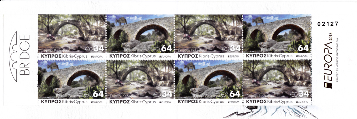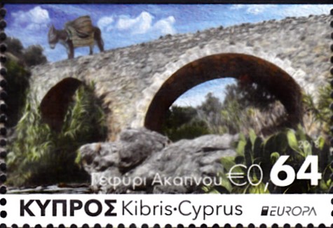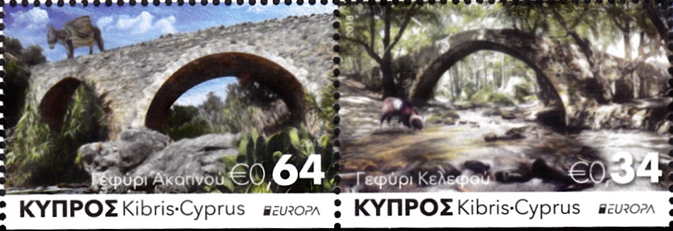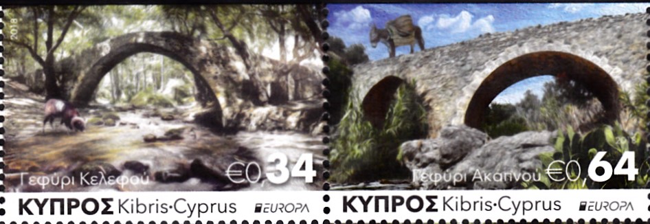 In Zypern erschien die Europamarken 2018 zum Gemeinschaftsthema "Brücken" am 2. Mai 2018. Hier eine vierseitig gezähnte Marke zu 0,64 € (MiNr 1392 A) mit einer Abbildung der Akapnou-Brücke in Limassol mit einem Esel. Die Auflage der Marke betrug 90 000 Stück.