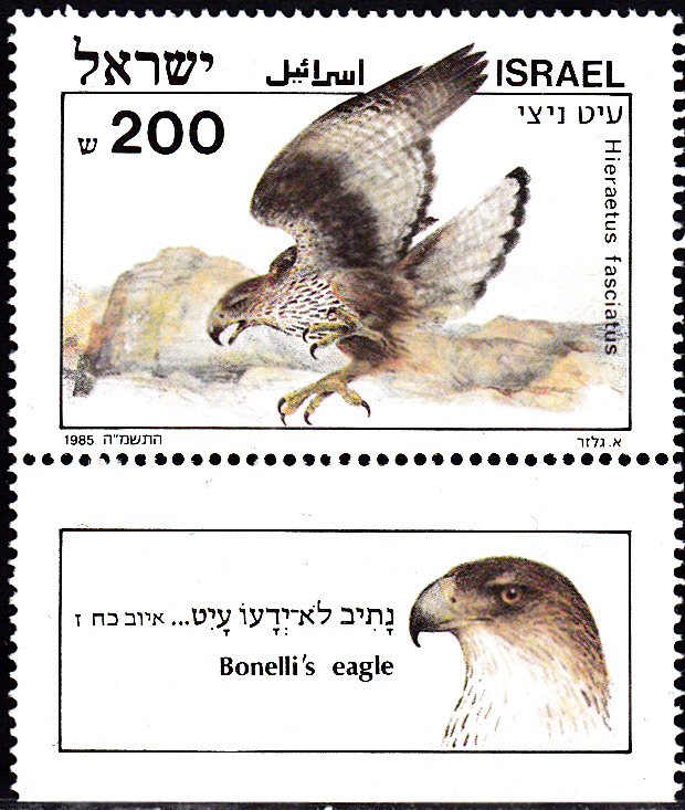 Diese Marke aus Israel (MiNr 982) zeigt uns einen Habichtsadler (Hieraetus fasciatus) bei einem Sturzflug und auf dem anhängenden Tab einen Kopf des Vogels.