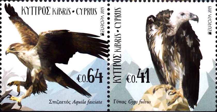 Die Europamarken 2019 sind in Zypern am 2. Mai 2019 zum Gemeinschaftsthema "Einheimische Vögel" erschienen. Hier zeige ich eine vierseitig gezähnte Marke zu 0,41 € (MiNr 1408 A) mit einem Gänsegeier (Gyps fulvus). Die Auflage dieser Marke betrug 110 000 Stück.