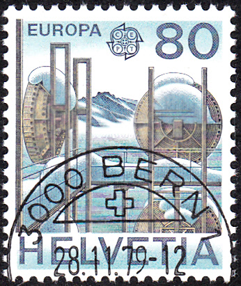 In der Schweiz erschienen die Europamarken 1979 zum Gemeinschaftsthema "Geschichte des Post- und Fernmeldewesens" am 30. April 1979. Hier die Marke zu 80 Rappen mit der Abbildung der Alpinen Relaisstation Jungfraujoch. Die Auflage betrug 11 241 000 Stück.