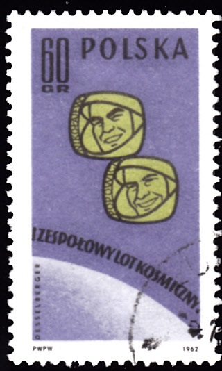 In Polen erschien zum Gruppenflug von Wostok 3 und Wostok 4 diese Marke (MiNr 1350) mit den beiden Kosmonauten