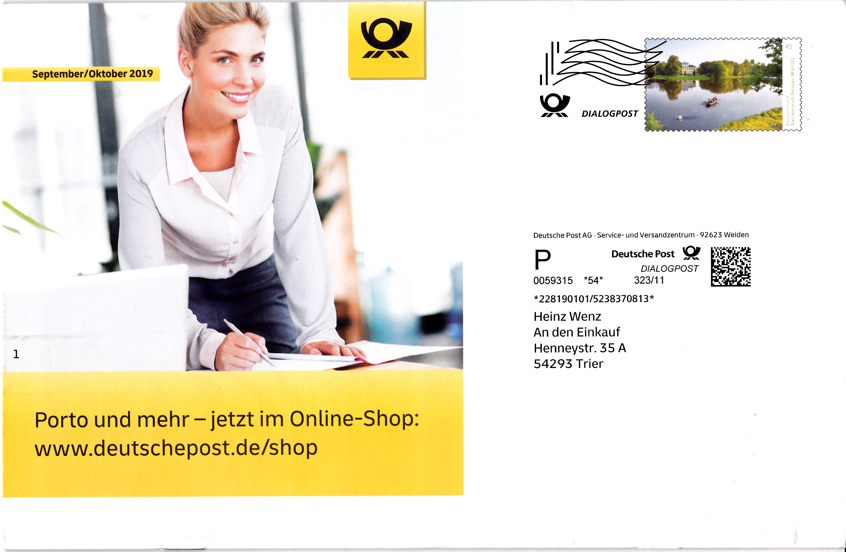Diese Broschüre im Format 235 x 152 mm (unten geheftet) hat einen Wertstempel mit einer 45 Cent Marke "Gartenreich Dessau-Wörlitz" aus der Serie "Deutschlands schönste Panoramen" (MiNr 3401). Die Marke ist mit einer Welle "Dialogpost" entwertet.