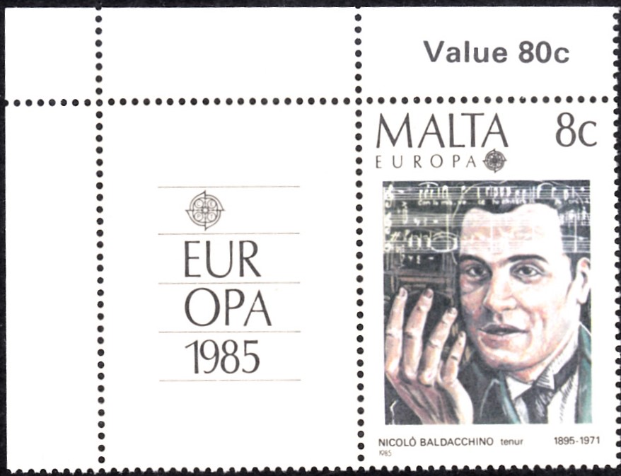 In Malta erschienen die Europamarken 1985 am 25. April 1985 zum Gemeinschaftsthema "Europäisches Jahr der Musik". Hier zeigen ich die Marke zu 8 Cent mit einem Porträt von Nicolò Baldacchino (1895-1971, Tenor) mit dem Zierfeld aus Feld 1 aus dem Kleinbogen von jeweils zehn Marken und zwei verschiedenen Zierfeldern (Feld 1 und Feld 4).