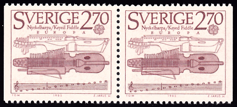 In Schweden erschienen die Europamarken 1985 am 24. April 1985 zum Gemeinschaftsthema "Europäisches Jahr der Musik". Hier die Marke zu 2,70 Kronen mit einer Schlüsselfiedel aus dem 15. Jahrhundert. Die Auflage der Marke betrug insgesamt 11 204 000 Stück. Hier zeige ich eine links nicht gezähnte Marke (MiNr 1329 Dl).