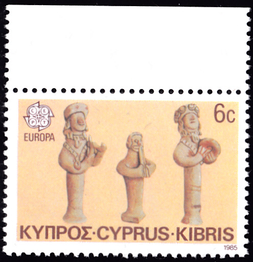 In Zypern erschienen die Europamarken 1985 am 6. Mai 1985 zum Gemeinschaftsthema "Europäisches Jahr der Musik". Hier die Marke zu 6 Cent mit der Abbildung von drei Musikanten (Tonfiguren). Die Auflage der Marke betrug 700 000 Stück.